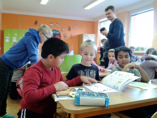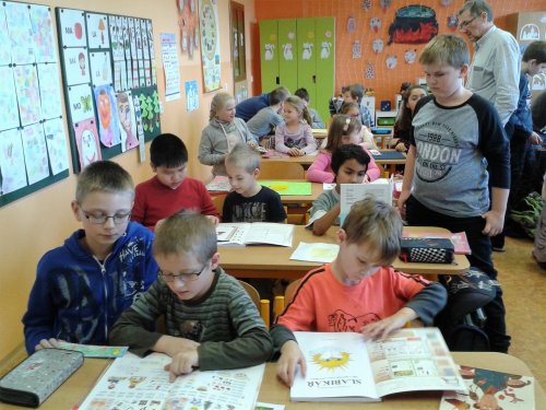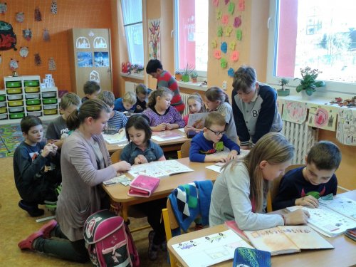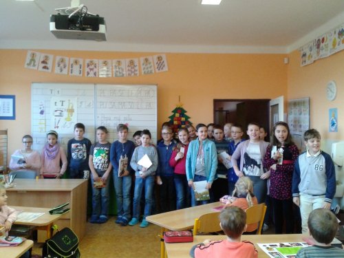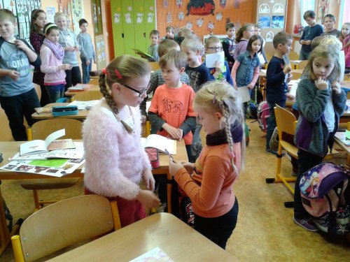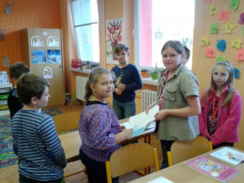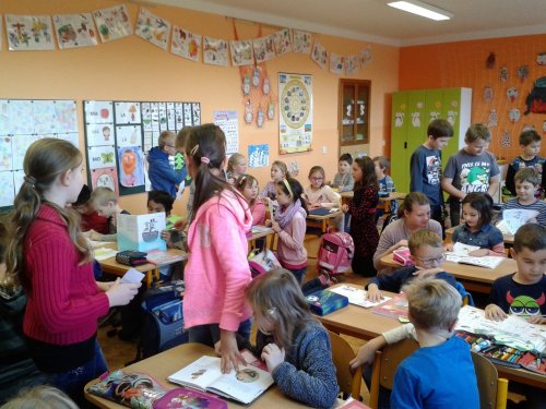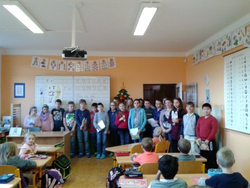 V pátek 2. prosince 2016 proběhlo v 1. třídě "Předávání záložek ke Slabikáři" v rámci patronátu s 5. třídou. Patroni si přinesli pěkné knížky, ze kterých prvňáčkům přečetli. Se svými mladšími kamarády si také povyprávěli, jak se má s knížkami zacházet. Také prvňáčci se nenechali zahanbit. Ukázali, jak už sami dokáží číst nejen slova, ale i kratší věty. V závěru akce předali páťáci vlastnoručně vyrobené záložky prvákům. Ti jim jako poděkování přichystali krásně nakreslené obrázky a zazpívali zimní písničku. Tato akce proběhla za účasti třídních učitelů 1. a 5. třídy a pana ředitele Mgr. Tomáše Korduly.